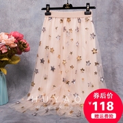 • 宝贝名称: 2018新款重工亮片刺绣星星图案高腰大摆杏色网纱裙半身裙长裙女夏