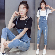 • 宝贝名称: 古着背带裤女春夏韩版宽松显瘦森女系学生可爱破洞牛仔九分裤套装
