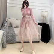 • 宝贝名称: 韩版chic时尚小香风套装女高领针织打底连衣短裙V领网纱裙两件套