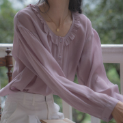 • 宝贝名称: 即jicouture法式气质圆领荷叶边长袖宽松天丝雪纺紫色防晒衬衫 女