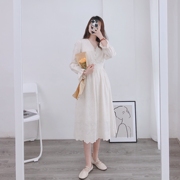 • 宝贝名称: 叶子家2021春季新款法式高腰显瘦收腰V领喇叭袖纯棉蕾丝连衣裙女
