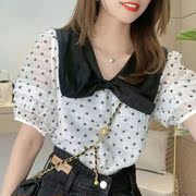 • 宝贝名称: 蝴蝶结翻领衬衫女2021新款夏季韩版v领短袖小花印花百搭减龄上衣