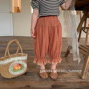 • 宝贝名称: 2021夏季新款韩版森系女童纯色花边防蚊裤墨兰色裤脚收脚阔腿长裤