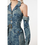 • 宝贝名称: 辣妹挂颈牛仔洋装小众设计感收腰蓝色扎染性感露肩短裙子女夏季