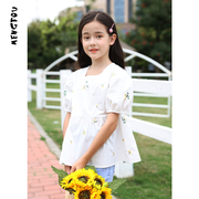 • 宝贝名称: 萌否2021夏装新款女童刺绣t恤清新短袖纯棉中大童洋气方领上衣