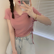 • 宝贝名称: 又纯又欲!2021年夏季新款bm风短款抽绳木耳边V领短袖T恤女上衣潮