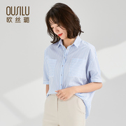• 宝贝名称: 欧丝璐条纹衬衫女夏季新款韩版修身衬衫立领通勤纯棉中袖上衣
