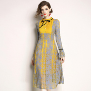 • 宝贝名称: 欧洲站2019秋装新品大牌蕾丝系带喇叭袖过膝连衣裙气质修身蕾丝裙