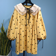 • 宝贝名称: 灯芯绒爱心印花娃娃领高腰A字初恋少女裙 灯笼袖荷叶边娃娃连衣裙