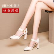 • 宝贝名称: 2019春季新款米白色真皮方头包脚高跟凉鞋女一字扣带粗跟中空单鞋