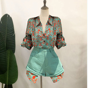 • 宝贝名称: 繁花似锦 复古印花不规则露腰衬衫两件套休闲短裤套装女