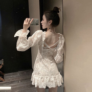 • 宝贝名称: 心机交叉露背蕾丝荷叶边裙女2019秋季新款V领系带长袖收腰连衣裙