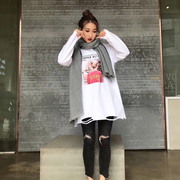 • 宝贝名称: 2020春秋外穿打底t恤女宽松加绒衫韩版长袖新款下摆破洞红色印花T