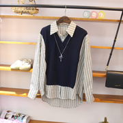 • 宝贝名称: 欧货显瘦拼接衬衫女条纹叠穿韩范假两件小个子翻领宽松春款卫衣潮