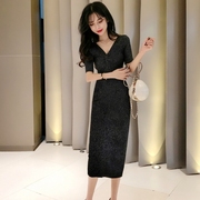 • 宝贝名称: 2020春夏新款性感V领半袖修身包臀韩版亮丝针织连衣裙泫雅风黑色