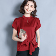 • 宝贝名称: 绑带冰丝立领红色上衣女配阔腿裤气质真丝小衫遮肚子夏装T桖短袖