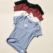 • 宝贝名称: 巨显瘦外贸工厂女装亨利领弹力修身坑条荷叶木尔边短袖T恤衫上衣