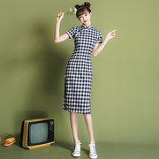 • 宝贝名称: 格子旗袍改良版连衣裙中长款藏蓝色文艺复古学生年轻款少女中国风
