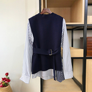 • 宝贝名称: YJYOMF 时髦两件套 侧开叉针织马甲+条纹长袖圆领压褶衬衫 配腰带