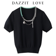 • 宝贝名称: 素卅 2021夏装新款百搭显瘦华丽金属链条装饰短袖针织衫毛衣女