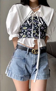 • 宝贝名称: 迷鹿家娃娃领系带小开衫短款纯白衬衣夏季衬衫女碎花吊带背心套装