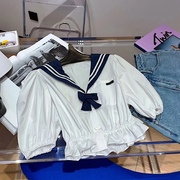• 宝贝名称: 正确版!徐璐同款法式海军领蝴蝶结v领泡泡袖撞色收腰衬衫上衣潮