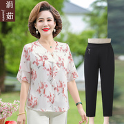 • 宝贝名称: 年轻妈妈夏装中袖T恤洋气小衫高贵中年妇女夏季碎花雪纺短袖套装