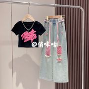 • 宝贝名称: 俏咪咕童装女童秋季新款立体喷绘涂鸦短袖彩色牛仔破洞裤套装