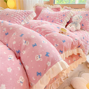 • 宝贝名称: 小清新牛奶绒四件套冬季加厚法兰珊瑚绒夹棉床盖花边被套床上用品