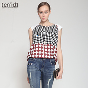 enid夏季新品宽松棋盘格印花中长款衬衫无袖上衣女夏1628816EM