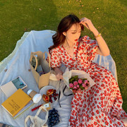Sandro Didier红色一片式连衣裙女2021夏季小个子气质收腰碎花裙