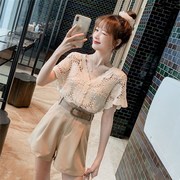 WEYLAYNY时尚洋气套装女2021夏季新款减龄镂空小衫阔腿短裤两件套
