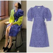 现货 买手店 Ganni 2022新款 长春花蓝抽象立体提花裹身连衣裙