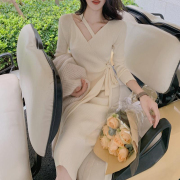 Sandro Moscoloni小香风针织连衣裙女秋季过膝系带收腰遮肚心机裙