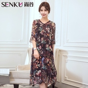 SENKU/尚谷 中袖桑蚕丝印花 真丝妈妈连衣裙 宽松腰碎花裙子E789