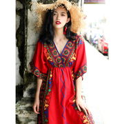 LENIBERK民族风红色连衣裙女胖mm气质高腰V领显瘦海边度假沙滩裙
