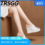 TRSGG厚底坡跟凉拖鞋2019夏季新款内增高10cm小白鞋真皮鱼嘴拖鞋