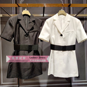 2021夏新款伍欧时力淼西装领高腰短袖纯色配腰带连衣裙1NH208636F