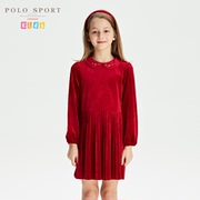 polosport童装女童长袖连衣裙2022春季新品天鹅绒红色气质百褶裙