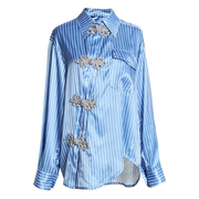 2021夏季乌家复古蓝色条纹斜门襟盘扣不对称气质衬衫女UY912C1218