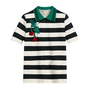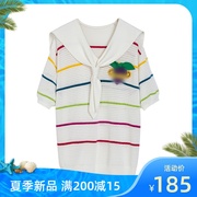 海乌丫21夏绣花葡萄彩虹条纹海军领短袖针织衫T恤百搭薄上衣女潮