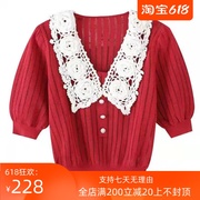 芷乌丫21夏宋轶勾花V领短袖针织红色镂空POLO衫T恤上衣 UY124M253