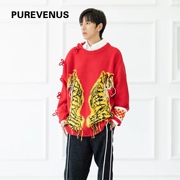 丿未PUREVENUS 虎年贺岁老虎流苏两穿中国红毛衣羊毛盘扣男女同款