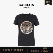 【M】BALMAIN/巴尔曼 黑色圆领经典logo烫金纹章女士短袖T恤上衣