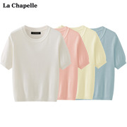 拉夏贝尔/La Chapelle夏圆领简约白色针织短袖t恤女纯色体恤上衣
