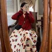 amii sandro2022绣花樱桃毛呢半身裙两件套春秋红色针织开衫套装