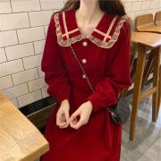 amii sandro2022小香风订婚红色裙子女春秋季娃娃领金丝绒连衣裙