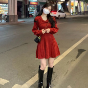 amii sandro2022年小香风金丝绒红色连衣裙女圣诞年会小礼服裙子