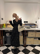 ski by Tannin约会玫瑰岛碎花黑色连衣裙女春夏中长款荷叶边裙子