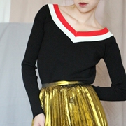 李媛同款撞色条纹一字领短款修身长袖毛衣露肩针织衫MA173SWT307